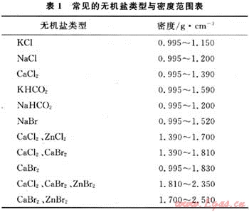 完井液、壓井液體系所采用的加重材料主要是可溶性無機(jī)鹽類,主要用來增加或調(diào)節(jié)完井液、壓井液的密度,常見的無機(jī)鹽及其密度范圍,見表1。對高含H2S的油氣井,進(jìn)行完井修井作業(yè)所采用的體系中不宜采用ZnCl2、ZnBr2作為加重材料,除非采用新型除硫劑技術(shù),以免因產(chǎn)生ZnS沉淀破壞液體性能的穩(wěn)定性,甚至誘發(fā)井下安全事故發(fā)生和損害地層。