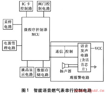 智能語音燃氣表控制電路主要由電源管理電路、采樣電路、液晶顯示電路、數(shù)據(jù)存儲電路、IC卡控制電路、閥門控制電路及報警電路組成MCU的外圍電路組成,這些電路由MCU進行統(tǒng)一管理,協(xié)調(diào)各部分電路的工作。語音燃氣表就是將原報警電路部分去掉,用現(xiàn)報警電路替代,以實現(xiàn)語音報警功能。