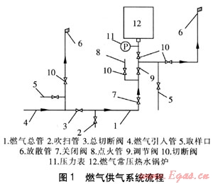 燃?xì)夤庀到y(tǒng)流程見(jiàn)圖1。燃?xì)夤艿涝谕V惯\(yùn)行進(jìn)行檢修時(shí),為檢修工作安全,需要管道內(nèi)的燃?xì)獯祾吒蓛?。系統(tǒng)在較長(zhǎng)時(shí)間停止工作后再投入運(yùn)行前,也需要進(jìn)行吹掃。因此,在鍋爐房供氣系統(tǒng)設(shè)計(jì)中,應(yīng)設(shè)置吹掃和放散管道。放散管出口應(yīng)高出屋脊2m以上。由鍋爐房外部引入的燃?xì)饪偣?,在進(jìn)口處應(yīng)裝設(shè)燃?xì)饪偳袛嚅y,按燃?xì)饬鲃?dòng)的方向,閥前應(yīng)裝放散管,并在放散管上裝設(shè)取樣口,閥后應(yīng)裝吹掃管。為保證鍋爐安全可靠運(yùn)行,要求供氣管和其他管道上安裝的附件連接嚴(yán)密可靠,能承受最高使用壓力,且不得裝設(shè)在高溫和有危險(xiǎn)的地方[3、4]。