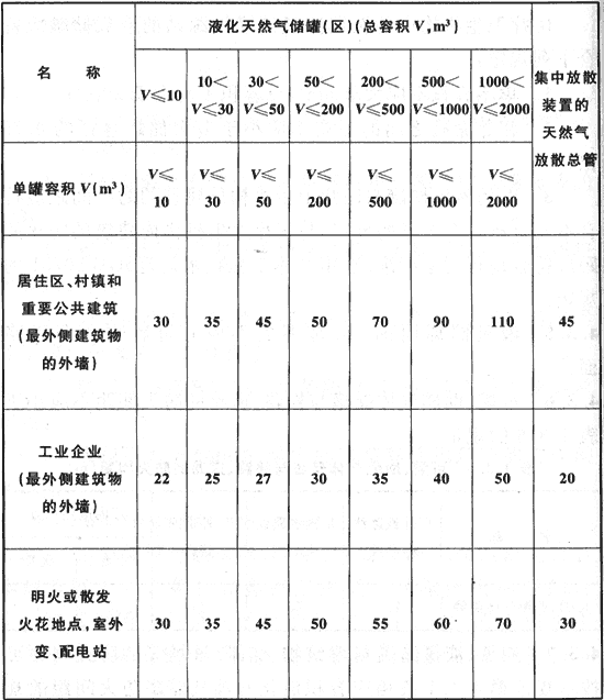 4.3.8 液化天然氣氣化站的液化天然氣儲罐(區(qū))與站外建筑等的防火間距不應(yīng)小于表4.3.8的規(guī)定,與表4.3.8未規(guī)定的其他建筑的防火間距,應(yīng)符合現(xiàn)行國家標準《城鎮(zhèn)燃氣設(shè)計規(guī)范》GB 50028的規(guī)定。