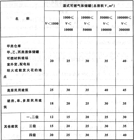 1 濕式可燃氣體儲罐與建筑物、儲罐、堆場等的防火間距不應(yīng)小于表4.3.1的規(guī)定。