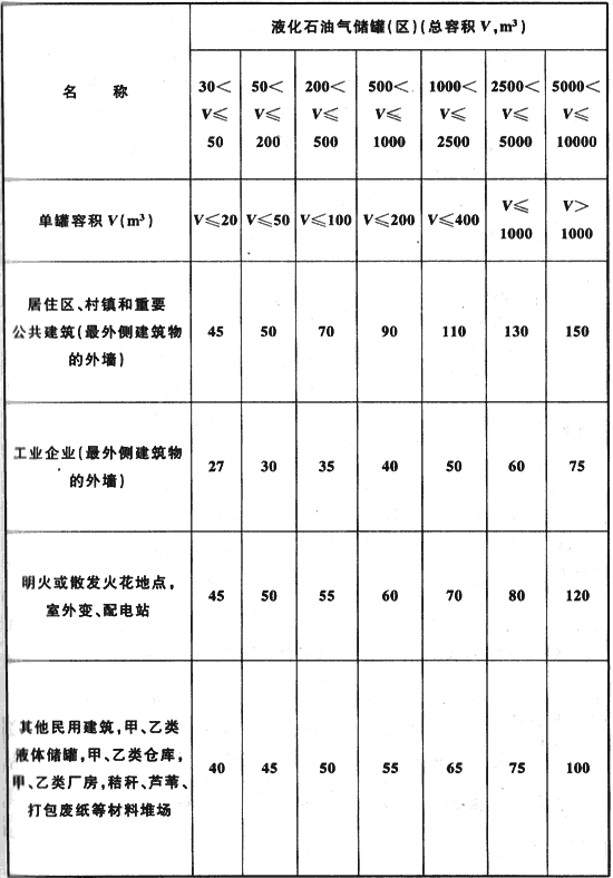 4.4.1 液化石油氣供應(yīng)基地的全壓式和半冷凍式儲(chǔ)罐(區(qū)),與明火或散發(fā)火花地點(diǎn)和基地外建筑等的防火間距不應(yīng)小于表4.4.1的規(guī)定,與表4.4.1未規(guī)定的其他建筑的防火間距應(yīng)符合現(xiàn)行國(guó)家標(biāo)準(zhǔn)《城鎮(zhèn)燃?xì)庠O(shè)計(jì)規(guī)范》GB 50028的規(guī)定。