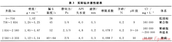 直井段采用低固相聚合物體系,膏鹽層段采用聚磺欠飽和一飽和鹽水體系,第3次開鉆井段采用聚磺體系。由于鹽層中高壓鹽水的存在,其存在又無(wú)規(guī)律,鹽水浸入又易導(dǎo)致鹽析發(fā)生卡鉆事故,現(xiàn)場(chǎng)試驗(yàn)地層裂壓力系數(shù)在1.9g/cm3以上。因此,該井膏鹽層使用了比直井更高的鉆井液密度,目的是防止斜井段壓鹽水浸和鹽層蠕動(dòng)變形。在膏鹽層段主要要提高井液的潤(rùn)滑性,防止阻卡及降低鉆井液的流動(dòng)阻力,高鉆井液的抗污染能力。有效避免鹽膏層的溶解、染、縮徑、大井徑、井塌等一系列井下復(fù)雜和事故的發(fā)生,實(shí)際鉆井液性能,見表3。
