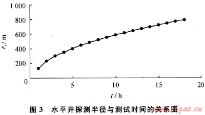 給定水平井段長度為500m,氣層厚度為40m,水平滲透率為0.005μm2,各向異性系數(shù)為2,氣體黏度為0.04mPa·s,孔隙度為10%,綜合壓縮系數(shù)為0.0005MPa-1,測試時間1~18h。由式(8)得出探測半徑與測試時間的關(guān)系如圖3所示。從圖3可以看出,探測半徑隨時間延長上升幅度減小,呈現(xiàn)非線性特征。