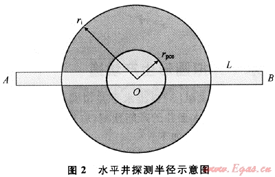 基于以上認(rèn)識和假設(shè),將水平井的探測半徑定義為:以水平段AB的中點為圓心0,以擬圓形生產(chǎn)坑道外緣半徑為基準(zhǔn),在生產(chǎn)過程壓力脈沖響應(yīng)達到的最大位置至圓心O的距離(圖2)。