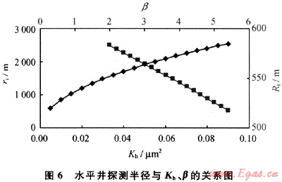 將式(9)代入式(8)可計算徑向復(fù)合油氣藏水平井探測半徑。計算時需要采用試湊法求解。