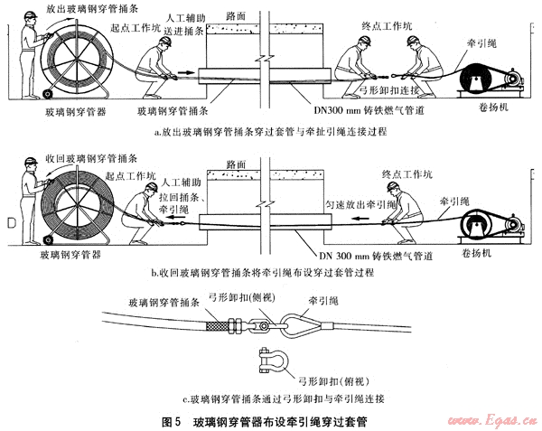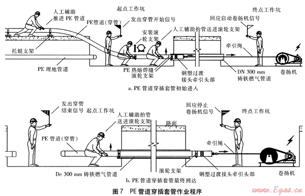 以下介紹以卷?yè)P(yáng)機(jī)作為機(jī)械牽引動(dòng)力、以廢舊的DN 300mm鑄鐵燃?xì)夤艿雷鳛樘坠?、以NOD 200mm的PE燃?xì)夤艿肋M(jìn)行穿插套管的施工技術(shù)。