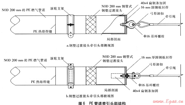 牽引頭部采用與PE管道相同規(guī)格的鋼塑過(guò)渡接頭制成,鋼塑過(guò)渡接頭的PE管端與NOD 20mm的PE管道熱熔焊接,DN 200mm鋼管端用厚度為16mm、直徑為219mm的圓形鋼蓋板滿焊封閉。鋼蓋板中心開有直徑為20mm的圓孔,事先穿入M16帶肩吊環(huán)螺栓1根(整體式鍛鋼材質(zhì)),鋼蓋板內(nèi)側(cè)用M16雙螺母緊固,吊環(huán)貼附于鋼蓋板外側(cè)。吊環(huán)圓孔內(nèi)、外徑分別為48、80mm,其底部與鋼蓋板通過(guò)焊接連為一體。吊環(huán)兩側(cè)各焊接1根規(guī)格為40×4的扁鋼條進(jìn)行加固,扁鋼條從鋼蓋板表面延伸至鋼塑過(guò)渡接頭DN 200mm鋼管端側(cè)面,所有焊縫均為滿焊。