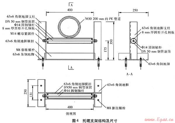 焊接完畢的待穿管PE管道,應(yīng)每隔5m設(shè)1組托輥支架對(duì)其進(jìn)行支撐。穿管作業(yè)時(shí),前行的PE管道帶動(dòng)滾筒圍繞軸桿轉(zhuǎn)動(dòng),接觸面呈滾動(dòng)摩擦狀態(tài),一方面可防止PE管道被地表硬物劃傷,另一方面可減小穿管時(shí)的摩擦阻力,加快穿管作業(yè)進(jìn)度,使PE管道沿預(yù)設(shè)的線路前進(jìn),不致于產(chǎn)生過(guò)大的偏移。托輥支架的結(jié)構(gòu)及尺寸見圖4。