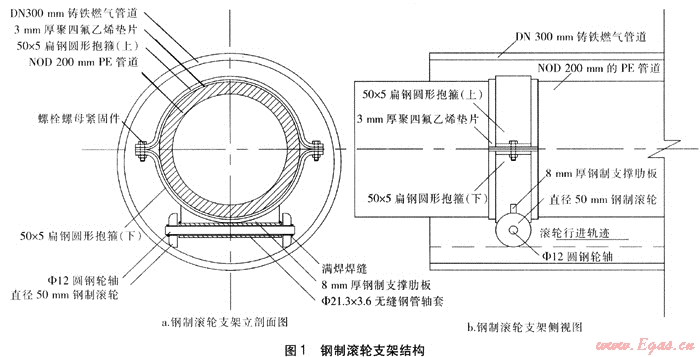 采用鋼制滾輪支架進(jìn)行PE燃?xì)夤艿来┎逄坠艿墓に囋頌椋阂詮U舊的鑄鐵燃?xì)夤艿雷鳛樘坠?,采用管徑稍小的PE管道作為穿插管[1],在PE燃?xì)夤艿郎厦扛粢欢尉嚯x安裝l組鋼制滾輪支架,通過(guò)抱箍的固定作用使PE管道載于鋼制滾輪支架之上;滾輪支架一方面支承PE燃?xì)夤艿雷陨碇亓?,另一方面能使PE管道在套管內(nèi)自由行進(jìn);通過(guò)人力、機(jī)械的牽引、推進(jìn)作用,使PE管道順利穿過(guò)套管,代替原管道進(jìn)行供氣,避免了大量開挖市政道路所帶來(lái)的困難。
