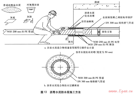 ⑤ 瀝青油麻填料外側(cè)50mm的空隙,用標(biāo)號(hào)為32.5的普通硅酸鹽水泥粉與環(huán)氧煤瀝青漆按質(zhì)量比為1:1.5的比例,調(diào)和成質(zhì)地均勻、可塑性良好的膠泥狀混合物,將其填塞進(jìn)套管圓周的空隙內(nèi),用灰抹等工具對(duì)瀝青水泥混合物的外側(cè)表面進(jìn)行壓實(shí)、抹光。瀝青水泥混合物填塞套管圓周空隙的做法見圖13。