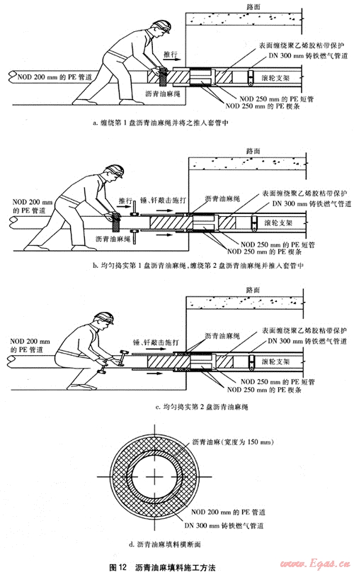 ④ 瀝青油麻填料一般分2次填塞,以確保其密實(shí)度,具體做法見圖12。將直徑為30mm的油麻繩用環(huán)氧煤瀝青漆浸泡15min后取出,均勻纏繞在NOD 200mm的PE燃?xì)夤艿郎?PE管道表面事先纏繞1層聚乙烯膠粘帶保護(hù),搭接寬度為膠粘帶寬度的50%,纏繞長(zhǎng)度為1000mm),待形成寬度約80mm,外徑約300mm的盤狀繩圈后,將瀝青油麻繩推入套管內(nèi)的空隙內(nèi),用直徑為20mm、一端為光圓鈍頭的鋼筋釬棒均勻搗實(shí)瀝青油麻繩,并使之緊貼于NOD 250mm的PE短管承托的外側(cè)端面上。按同樣要求纏繞、搗實(shí)第2盤瀝青油麻繩,瀝青油麻填料的最終寬度為150mm。