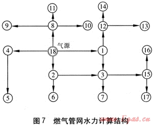 圖7為燃?xì)夤芫W(wǎng)水力計(jì)算結(jié)構(gòu),進(jìn)行水力計(jì)算后在Auto CAD中自動(dòng)輸出的水力計(jì)算結(jié)果標(biāo)注圖見圖8。