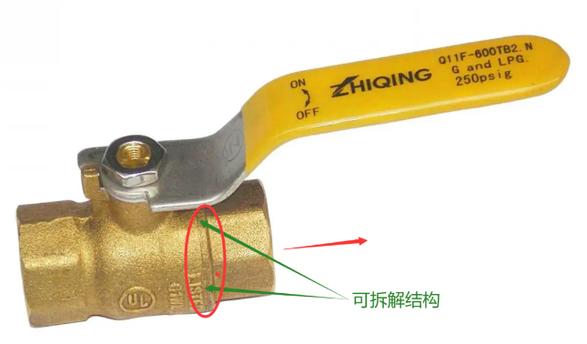 如果上述的球閥安裝方向分正反的話,那這種常見的球閥我想是不是也該按紅色箭頭安裝方向進(jìn)行安裝。因?yàn)橛覀?cè)也是一個(gè)可拆解的結(jié)構(gòu)(猜測(cè)很難拆解,但維修過(guò)閥門的都知道,另外閥門本體此處泄漏的可能性有多少?)。