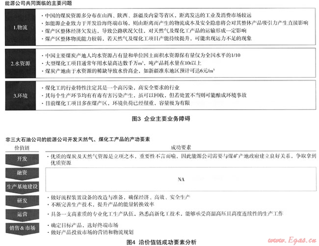 從目前情況來(lái)看,能源企業(yè)要開(kāi)發(fā)非常規(guī)天然氣從事煤化工業(yè)務(wù)均需要消除以下障礙(圖3)。第一,物流:中國(guó)的煤炭資源多分布在山西、陜西,尤其是新疆及內(nèi)蒙等省區(qū),距離發(fā)達(dá)的工業(yè)及消費(fèi)市場(chǎng)較遠(yuǎn)。物流成本及運(yùn)輸安全隱患將會(huì)對(duì)企業(yè)運(yùn)營(yíng)產(chǎn)生直接影響。與此同時(shí),煤產(chǎn)區(qū)整體經(jīng)濟(jì)欠發(fā)達(dá),公路狀況欠佳,對(duì)天然氣及煤化工產(chǎn)品便利的運(yùn)輸也造成能源公司共同面臨的主要問(wèn)題一定影響;第二,水資源:中國(guó)主要煤炭產(chǎn)地人均水資源占有量和單位國(guó)土面積水資源保有量?jī)H為全國(guó)平均水平的1/10,而大型煤化工項(xiàng)目通常年用水量高達(dá)數(shù)千萬(wàn)m3,噸產(chǎn)品耗水量在1Ot左右,供求關(guān)系的嚴(yán)重失衡,造成煤炭產(chǎn)地水價(jià)高企,如新疆某煤化工園區(qū)的水價(jià)預(yù)測(cè)可達(dá)6元/m3,對(duì)項(xiàng)目經(jīng)濟(jì)陛產(chǎn)生較大影響;第三,環(huán)境:煤化工的行業(yè)是高污染,高安全要求的行業(yè)。每個(gè)生產(chǎn)環(huán)節(jié)均有有毒有害污染物產(chǎn)生,如若處置不當(dāng)就可能釀成環(huán)境事故。目前煤化工項(xiàng)目多在煤產(chǎn)區(qū),環(huán)境負(fù)荷已經(jīng)很重,環(huán)境容量有限,若一哄而上以產(chǎn)能、產(chǎn)量為目標(biāo),則可能對(duì)環(huán)境造成無(wú)法挽回的影響。