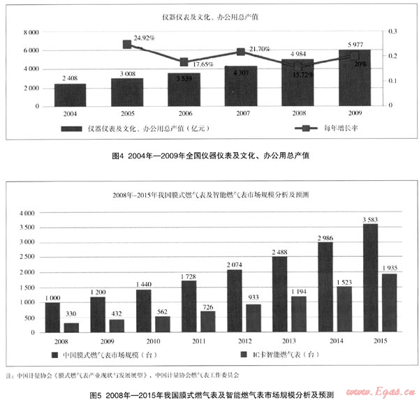 根據(jù)中國(guó)計(jì)量協(xié)會(huì)的相關(guān)數(shù)據(jù),我國(guó)目前約有100家燃?xì)獗韽S,2008年總產(chǎn)量為1000萬臺(tái),每年的復(fù)合增長(zhǎng)率約為20%。具有中國(guó)特色的智能膜式燃?xì)獗?,以IC卡預(yù)付費(fèi)為主導(dǎo)產(chǎn)品,總量逐年上升,已占膜式燃?xì)獗砜偭康?0%以上。預(yù)計(jì)2015年我國(guó)燃?xì)獗砜偖a(chǎn)量為3583萬臺(tái),智能燃?xì)獗砜偖a(chǎn)量為1935萬臺(tái)。