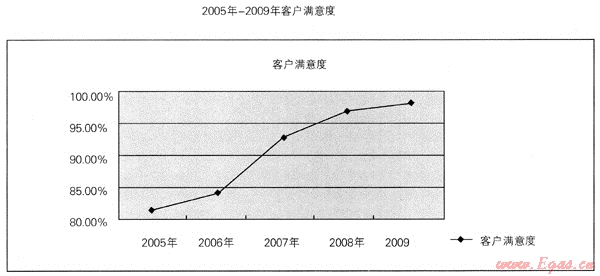 (2) 重慶燃?xì)饧瘓F(tuán)按照客戶滿意度測(cè)評(píng)表的項(xiàng)目和內(nèi)容進(jìn)行客戶滿意度測(cè)評(píng),測(cè)評(píng)數(shù)據(jù)均由客服系統(tǒng)自動(dòng)生成。2005年-2009年客戶滿意度分別為:81.8%、84.3%、93%、97%、98.18%。