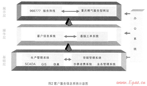重慶燃?xì)饧瘓F(tuán)充分利用現(xiàn)代計(jì)算機(jī)和通訊技術(shù),創(chuàng)建了先進(jìn)的客戶服務(wù)信息系統(tǒng),包括生產(chǎn)管理、營(yíng)銷管理、客戶資料、客戶服務(wù)工單、966777服務(wù)熱線五個(gè)方面,整個(gè)系統(tǒng)資源共享、無(wú)縫銜接,為客戶提供精細(xì)服務(wù)。服務(wù)流程是客戶服務(wù)工作的導(dǎo)向,為保證服務(wù)流程的統(tǒng)一,集團(tuán)公司通過建設(shè)客戶服務(wù)信息系統(tǒng),對(duì)服務(wù)流程進(jìn)行優(yōu)化,并在信息系統(tǒng)中對(duì)關(guān)鍵流程進(jìn)行固化。見圖2: