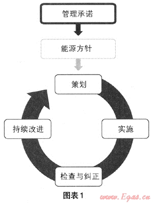 用能企業(yè)是實現能源節(jié)約的核心。在以節(jié)能減排為重要目標的指引下,企業(yè)使用任何能源,都應制定一個基本的控制程序,形成一個有效能源管理體系運行模式。企業(yè)為兌現管理承諾和實現能源方針應進行策劃-實施-檢查與糾正-持續(xù)改進(PDCA)等過程。圖示如下(圖表1):