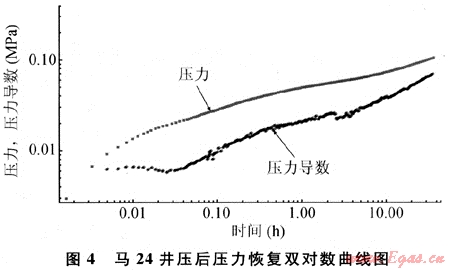 在馬24井為代表的壓后壓力雙對(duì)數(shù)曲線上,壓力與壓力導(dǎo)數(shù)成鐵軌狀,水力裂縫特征明顯,說明壓后在地層中形成了主裂縫(圖4)。