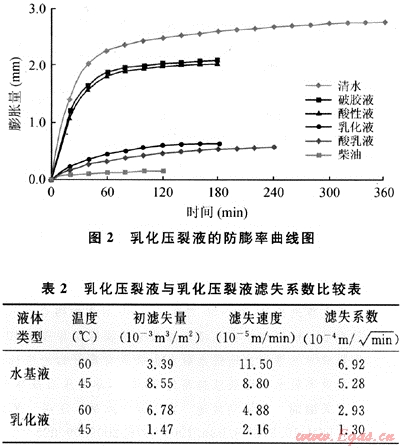 油基、泡沫和乳化壓裂液是目前對(duì)付強(qiáng)水敏地層壓裂改造的主要液體體系,因油基壓裂液在低溫下存在破膠困難和施工時(shí)的重大安全隱患,二氧化碳泡沫壓裂液要形成泡沫必須滿足一定的溫度條件,由于地層溫度低,在大部分裂縫中,壓裂液溫度小于CO2起泡溫度,不能形成泡沫,限制了它在儲(chǔ)層中的使用[2],而乳化壓裂液通過油相的乳化形成油水兩相降低濾失,同時(shí)大大減少了水相的用量,可以起到較好的防膨作用,安全隱患較油基小得多,因此選用乳化壓裂液體系作為強(qiáng)水敏地層的壓裂液體系。研究表明,油相:水相=1:1的乳化壓裂液體系防膨效率可以達(dá)到76.15%,較水基壓裂液提高50.0%,濾失系數(shù)降低60.0%~70.0%(見圖2、表2)。
