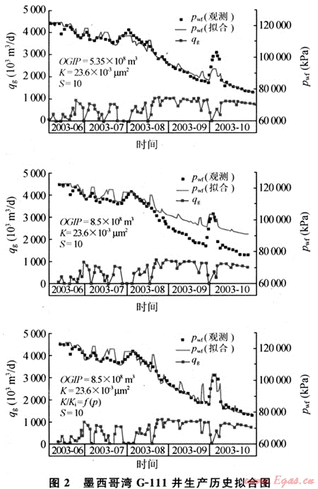 近期出現(xiàn)的“氣井生產(chǎn)動態(tài)曲線特征圖版擬合法”可以在不需要關井測壓的情況下計算氣井動態(tài)儲量,為復雜類型氣藏動態(tài)分析提供了有效手段,該方法的應用也逐漸受到技術人員的關注。值得強調的是,通過關井進行靜壓監(jiān)測是不可替代的。下面列舉墨西哥灣-氣井(G-111井,原始地層壓力122.7MPa,儲層溫度177℃)的實例來說明靜壓資料獲取對動態(tài)儲量計算的重要性。利用“氣井生產(chǎn)動態(tài)曲線特征圖版擬合法”中的“流動物質平衡”計算井控儲量5.35×108m3(圖1)。根據(jù)這一儲量計算結果,建立單井模型擬合生產(chǎn)歷史,井底流壓擬合程度高(圖2),如果沒有關井壓力作參照,可以認為流動物質平衡計算的井控儲量是可靠的。但如果參照關井壓力數(shù)據(jù),就會發(fā)現(xiàn)模型計值靜壓值偏低,說明井控儲量計算存在誤差,根據(jù)這一情況,對模型中井控儲量進行了調整,并考慮了滲透率的應力敏感性,完全擬合后,得到井控儲量為8.5×108m3。由此可見靜壓數(shù)據(jù)的獲取對動態(tài)儲量計算的重要性。