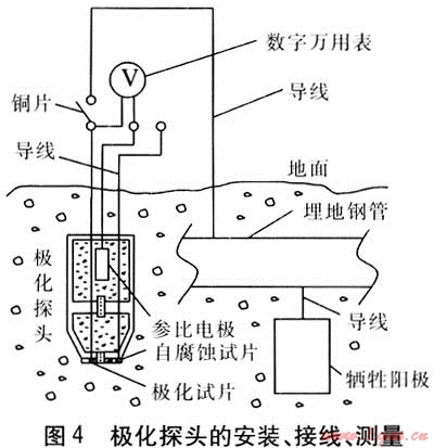 ② 接線:極化試片及自腐蝕試片導線分別引入測試樁各自接線柱上,被保護管道導線引入測試樁接線柱上,參比電極導線引入測試樁接線柱上,平時極化試片接線柱與被保護管道接線柱之間用導電銅片相連,意味著極化試片受到與管道相同的極化。