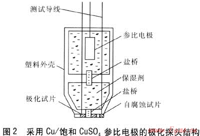 下面以Cu/飽和CuSO4參比電極探頭結(jié)構(gòu)為例進行說明,探頭結(jié)構(gòu)見圖2。該極化探頭分為上、下兩個腔室,上腔室為參比電極安裝室,下腔室安裝有極化試片、自腐蝕試片、保濕劑,上腔室與下腔室、下腔室與極化試片通過導電鹽橋連接[3]。極化探頭有3根導線分別與參比電極、極化試片、自腐蝕試片相連接。極化試片的連接導線既用作試片的極化線又兼作電位的測量線。