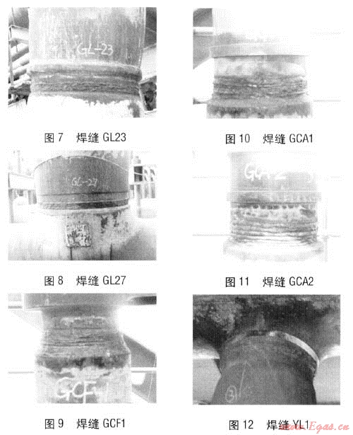 該鍋爐的設計結構存在以下特點:部分母材管件為三通式,連接方式為焊接連接,焊縫靠近三通管件的根部,且兩焊接件之間因壁厚不同,在焊縫附近形成不同程度的凸臺。我們篩選出12道典型的焊縫,焊接管道相關參數見表1,焊縫外觀見圖1~12.其中焊縫GL1的凸臺較小。由于凸臺與焊縫距離較近,導致無損探傷(射線、超聲波探傷)不能正常進行。對于在安裝現場發(fā)現的問題,由于新建電廠鍋爐多,設備外形較大、生產期長,鍋爐制造單位往往難以在限定的期限內對設備進行設計修改和現場改造。