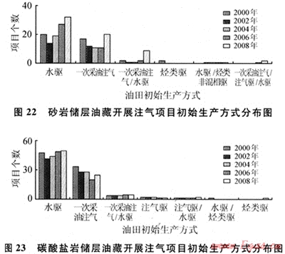 我國(guó)大部分油田仍以傳統(tǒng)的注水方式進(jìn)行開(kāi)發(fā),這些油藏能否注氣一直是關(guān)心的問(wèn)題。從圖22、23中可以看出:近10a來(lái),世界范圍內(nèi)無(wú)論是砂巖還是碳酸鹽巖油藏注氣項(xiàng)目,采用先注水后注氣的項(xiàng)目比進(jìn)行一次注氣的項(xiàng)目多,因此,無(wú)論是新油田的開(kāi)發(fā)還是老油田二次開(kāi)發(fā),注氣均被認(rèn)為是一項(xiàng)行之有效的提高采收率技術(shù)。