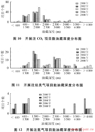 從理論上分析,CO2驅(qū)需要的混相壓力最低,所以實(shí)現(xiàn)混相的深度最淺,采用CO2驅(qū)的油藏深度主要分布在610~2000m(圖10),而且主要是混相驅(qū);烴類(lèi)氣驅(qū)混相壓力相對(duì)較高,油藏深度主要是1500~2000m及2500~3000m(圖11);氮?dú)怛?qū)所要求的混相壓力最高,但許多油藏都應(yīng)用了重力驅(qū),因此不需混相,目前實(shí)施的項(xiàng)目油藏深度在610~1500m范圍(圖12)。