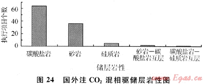 隨著全球?qū)O2排放引起大氣污染的日益重視,注CO2資源化利用潛力越來(lái)越大,其項(xiàng)目占了絕大部分。在我國(guó)開(kāi)展了很多注CO2的吞吐項(xiàng)目,部分CO2驅(qū)也在實(shí)施。國(guó)家也很重視CO2排放及資源利用,專(zhuān)門(mén)批準(zhǔn)“973”項(xiàng)目“溫室氣體提高石油采收率的資源化利用及地下埋存”,還設(shè)置了國(guó)家重大專(zhuān)項(xiàng)和“863”重點(diǎn)項(xiàng)目,對(duì)CO2埋存及資源化利用的各個(gè)方面進(jìn)行了全面研究。但我國(guó)目前大多數(shù)項(xiàng)目都未實(shí)現(xiàn)CO2混相驅(qū)。對(duì)國(guó)外2008~2009年注CO2混相驅(qū)的108個(gè)項(xiàng)目進(jìn)行統(tǒng)計(jì),表明國(guó)外注CO2混相驅(qū)原油黏度主要分布在0.8~1.2mPa·s,溫度主要分布在30~60℃,儲(chǔ)層深度在600~2000m的較多,碳酸鹽巖注氣滲透率主要在(0.1~10)×10-3μm2及(10~50)×10-3μm2范圍內(nèi),砂巖中注CO2是滲透率大于10×10-3μm2的油藏??梢?jiàn)國(guó)外主要是對(duì)碳酸鹽巖油藏進(jìn)行混相驅(qū)(圖24)。當(dāng)然其原油組成對(duì)混相壓力影響也較大,但由于沒(méi)有公布的數(shù)據(jù),因此這里未列出[9~10]。