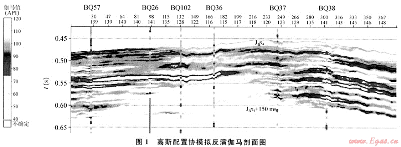 由于統(tǒng)計了多井點樣本數(shù)據(jù)的地質(zhì)、地震特性,在儲層屬性建模中進(jìn)行約束,這優(yōu)化了對儲層的模擬。從利用該模塊反演的過井Gamma剖面看,其整體面貌好,但個別井始終對應(yīng)不好(如BQ36井)。
