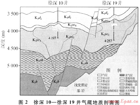 實(shí)測(cè)資料顯示徐家圍子斷陷徐南地區(qū)目前發(fā)現(xiàn)有2口井存在超壓現(xiàn)象,分別為徐深19井和徐深10井,超壓層位為下白堊統(tǒng)營(yíng)城組一段(表1)。通過(guò)研究這兩口井的氣藏地質(zhì)剖面來(lái)分析該地區(qū)超壓的形成原因(圖2)。