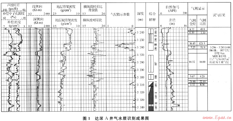 中基性火山巖儲層氣水層識別是一項較為困難的工作,僅靠單一識別方法在實際工作中存在一定的局限性。為避免在測井解釋中出現(xiàn)的氣層誤判、漏判現(xiàn)象,綜合以上3種方法,應(yīng)用綜合概率法,制定了一個氣層指示參數(shù),氣層指示參數(shù)越大,表明該井段含氣性更好。如圖1達深A(yù)井氣層指示參數(shù)曲線最高的186Ⅲ號層,其對應(yīng)的錄井氣測比值也是最高的,氣測比值達到121.5;而氣層指示參數(shù)曲線為零或為不連續(xù)的零星小段處,錄井均未見氣測顯示,綜合解釋為干層或水層,說明氣層指示參數(shù)曲線與含氣性一致性較好。