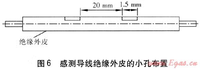 感測導(dǎo)線的絕緣外皮有規(guī)則的孔(見圖6),小孔可以感知保溫層濕度的變化??椎拈g隔為20mm,每個小孔的寬度為1.5mm。漏點(diǎn)檢測系統(tǒng)要求感測導(dǎo)線、反饋導(dǎo)線與管道之間的阻抗以及兩導(dǎo)線之間的絕緣電阻必須大于等于50MΩ。