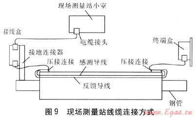 現(xiàn)場測量站線纜連接方式見圖9。主要連接裝置有:現(xiàn)場測量站小室內(nèi)安裝漏點(diǎn)檢測模塊、通信模塊等;現(xiàn)場測量站小室與接線盒之間的連接電纜;帶有接地連接器的接線盒;用于連接感測導(dǎo)線與反饋導(dǎo)線的終端盒等。現(xiàn)場測量小室、接線盒、終端盒、連接電纜的防護(hù)等級均為IP65。