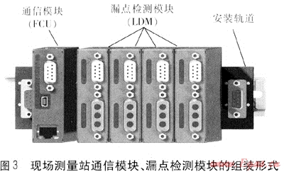 現(xiàn)場測量站通信模塊、漏點(diǎn)檢測模塊的組裝形式見圖3,所有模塊均安裝在軌道底板上,結(jié)構(gòu)簡單,安裝方便。漏點(diǎn)檢測模塊的作用是:測量管道與傳感器導(dǎo)線之間的阻抗;通過傳感器導(dǎo)線與其他漏點(diǎn)檢測模塊通信(采用管段兩端測量時);支持不同管段通信模塊間的數(shù)據(jù)傳輸;當(dāng)有泄漏發(fā)生時,發(fā)出報警信號。