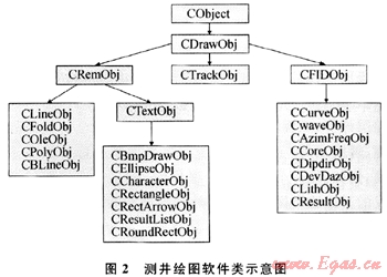 要解決這些問題,采用面向?qū)ο蟪绦蛟O(shè)計理念是最佳的選擇[3]。在圖2軟件主要類的劃分及繼承關(guān)系圖中,CDrawObj類是直接從CObject繼承而來的所有測井圖形類的基類,主要保存著圖形對象的繪圖區(qū)域(m_Rect)和當前繪圖文檔的指針(*pDoc),完成光標在屏幕上的滾動DoScroll(CScrollView*pView),保存、顯示當前光標所在位置等功能,它是測井繪圖軟件所有對象動態(tài)識別的入口。
