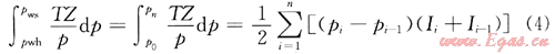 對式(2)的右邊進(jìn)行數(shù)值積分,把(pws,pwh)段平均分作n個(gè)壓力段(pi-1,pi){i=1,2,3,…,n;p0=pwh,pn=pws),并使每個(gè)壓力段的步長足夠小,則有: