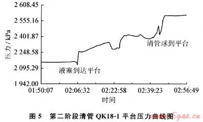 2010年2月5日開始第一階段清管,從QK18-1平臺發(fā)送專門研制的泡沫清管球,約4h后終端處理廠收到清管球,清除積液約20m3(該管道在2個月前有過清管,故積液量少于預(yù)測值)。幾天后進(jìn)行第二階段清管,從BZ13-1平臺發(fā)送清管球,710min后管道出口壓力開始上升,750min后過球指示器動作顯示清管球到達(dá)。現(xiàn)場根據(jù)壓力曲線估計(jì)液塞段體積約150m3,QK18-1平臺壓力曲線圖如圖5所示。隨后進(jìn)入第三階段清管,再從QK18-1平臺發(fā)送清管球,經(jīng)過260min收到清管球,通過渤西油氣處理廠測算收到積液127m3,部分液體經(jīng)過QK18-1平臺處理轉(zhuǎn)入輸油管道。此次作業(yè)共清除積液約170m3,取得了輸氣管網(wǎng)清管作業(yè)的成功。