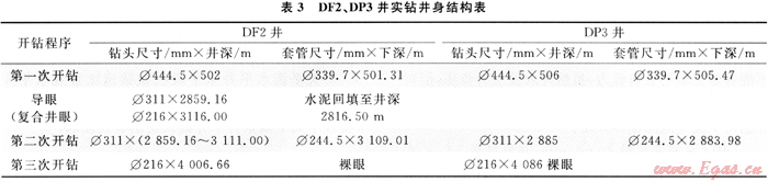 DF2、DP3井采用第三次開鉆井身結(jié)構(gòu),Φ339.7mm表套進(jìn)入中下侏羅統(tǒng)直羅組,封住上部膠結(jié)強(qiáng)度低、疏松、易垮塌地層,第二次開鉆采用Φ311mm鉆頭,下入Φ244.5mm技術(shù)套管封住造斜段。第三次開鉆采用Φ215.6mm鉆頭,為下步完井方式的選擇留有余地,如果獲得理想的自然產(chǎn)能則裸眼完井,若自然產(chǎn)能低先進(jìn)行氣舉、解堵,解堵后仍不能達(dá)到配產(chǎn)要求,可以下5½″尾管射孔完井,對(duì)儲(chǔ)層實(shí)施壓裂改造[5]。這樣既降低了施工風(fēng)險(xiǎn),又避免了小井眼中實(shí)施壓裂改造在工具上的局限性。鉆井實(shí)踐結(jié)果表明,這種井身結(jié)構(gòu)是合理的,其結(jié)構(gòu)簡(jiǎn)單、施工方便,具有可操作性和經(jīng)濟(jì)性。DF2、DP3井實(shí)鉆井身結(jié)構(gòu)如表3所示。