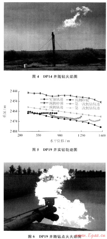 DP19井采用氮?dú)馀菽菲胶忏@水平井技術(shù),實(shí)現(xiàn)了隨鉆點(diǎn)火,火焰高達(dá)3~5m。在欠平衡水平段的鉆井過(guò)程中由于兩次鉆遇大段泥巖,進(jìn)行了兩次后退懸空下切側(cè)鉆繞泥,導(dǎo)致氮?dú)馀菽菲胶鈱?shí)鉆進(jìn)尺超過(guò)1500m,在整個(gè)欠平衡水平段鉆井過(guò)程中沒(méi)有出現(xiàn)井壁失穩(wěn)。圖5給出了DP19井氮?dú)馀菽菲胶馑蕉螌?shí)鉆軌跡,圖6給出了DP19井隨鉆點(diǎn)火情況。