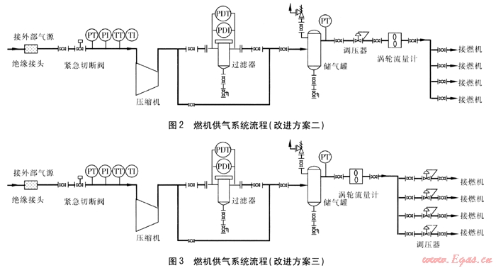 方案三:改進(jìn)思路與方案二相同,即在原系統(tǒng)中增加燃?xì)庹{(diào)壓器。本方案中調(diào)壓器不是設(shè)在儲(chǔ)氣罐之后,而是設(shè)在每臺(tái)燃機(jī)的燃料進(jìn)口處,壓縮機(jī)的設(shè)定壓力與方案二相同。本方案的工藝流程見(jiàn)圖3。