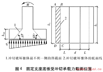 對(duì)固定支座矩形底板,應(yīng)驗(yàn)算擋板墻與底板交接處的受沖切承載力。固定支座底板受沖切承載力截面位置見圖4。