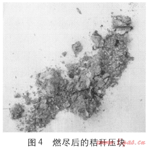 混燒不僅改善了燃煤的著火性能,還改善了主燃區(qū)燃料層內(nèi)空氣與燃料的混合。秸稈壓塊在冷態(tài)情況下是致密的塊狀結(jié)構(gòu),受熱時揮發(fā)分析出,自身將成為疏松的孔狀結(jié)構(gòu),且膨脹、體積增大。由圖3可以觀察到燃料層表層的體積膨脹后的秸稈壓塊。燃盡后的秸稈壓塊見圖4,其結(jié)構(gòu)是疏松多孔狀的。
