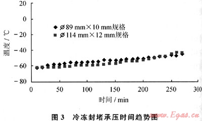 由表1可以看出,被冷凍的試驗管道在沒有維持熱量平衡的情況下可以承受較高壓力(2MPa)。因此水由液態(tài)變成固態(tài)以后,與試驗管道壁面的結(jié)合力及自身強度足以承受2MPa以上氣壓,說明冷凍封堵方案可以實施。