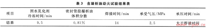 由試驗結(jié)果可以看出:在承受氣壓2.5MPa的情況下,密封管段凝析油體積分數(shù)為0.81%,已超過凝析油的爆炸下限0.6%,檢測得知封堵段后焊接端口的凝析油氣含量為0,說明固水乳化劑冷凍后能夠完全隔離油氣,在不采取置換掃線的情況下,能夠為動火作業(yè)提供安全保障;解凍后的固水乳化劑恢復(fù)原來的膏狀,易溶于水,結(jié)束焊接施工作業(yè)恢復(fù)輸氣后由氣流攜帶進入下游管道,在集氣站分離器中沉積,由分離器排污管線排出。