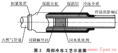 試驗研究表明局部冷凍封堵技術(shù)可成功應(yīng)用于小管徑天然氣管道的局部冷凍封堵,對隔離管內(nèi)油氣是行之有效的。局部冷凍封堵技術(shù)的作業(yè)管道承壓能力可超過2.5MPa,明顯優(yōu)于現(xiàn)有管道局部化學(xué)封堵技術(shù),承壓時間完全滿足管道焊接的要求,施工方便快捷,安全可靠,可實現(xiàn)不置換動火的技術(shù)需求。焊接施工完成后,當(dāng)固水乳化劑的溫度高于0℃,固水乳化劑即恢復(fù)原來狀態(tài),待天然氣管道恢復(fù)輸氣時隨天然氣一起排出。