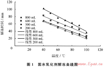 分別取固水乳化劑800mL、500mL、300mL、200mL,將它們冷凍固化后,看其是否產(chǎn)生裂紋;在不同的溫度下解凍,獲取解凍時間。試驗結(jié)果見表2和圖1。試驗結(jié)果表明固水乳化劑解凍后恢復(fù)成原來的膏狀,且具有良好的質(zhì)密性。